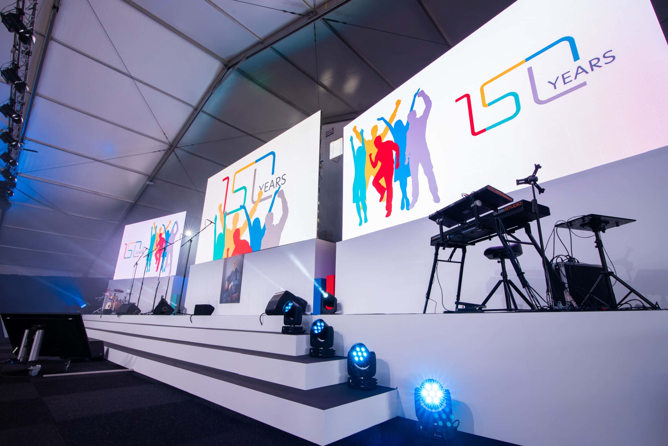 Das Besondere an diesem Event war, dass das Jubiläum weltweit an 16 weiteren Standorten zur gleichen Zeit gefeiert und per Live-Stream in die Zentrale nach Mönchengladbach zugeschaltet wurde. Das bedeutet, dass die gesamte Belegschaft von Scheidt & Bachmann an diesem Tag miteinander verbunden war, und gemeinsam ihr 150-Jähriges Bestehen zelebrieren konnte. Neben den Zuschaltungen, stellte vor allem die Simultan-Übersetzung eine Herausforderung dar. Mit mehreren Dolmetschern wurde das Event gleichzeitig in 3 verschiedene Sprachen übersetzt inkl. Live-Transkription, d. h. mit Untertiteln in der Originalsprache. Als Full-Service Dienstleister lieferten wir das ganze Spektrum an Technik – von LED Wänden mit passenden Rückwänden, über das Bühnen-Setup, bis zur Beleuchtung und Beschallung. Live-Bands, Vorträge und echte Interaktion … das Event war ein voller Erfolg!